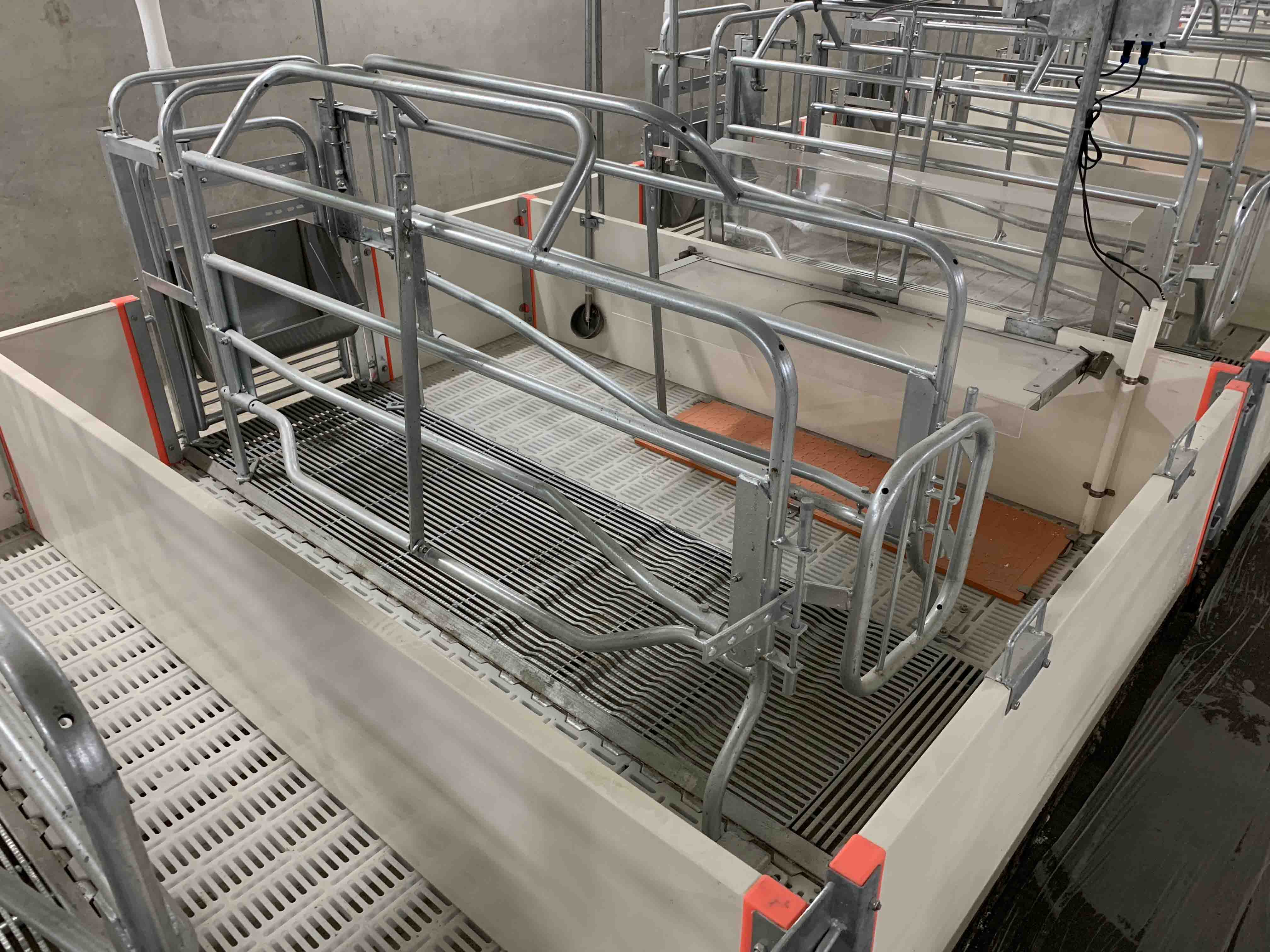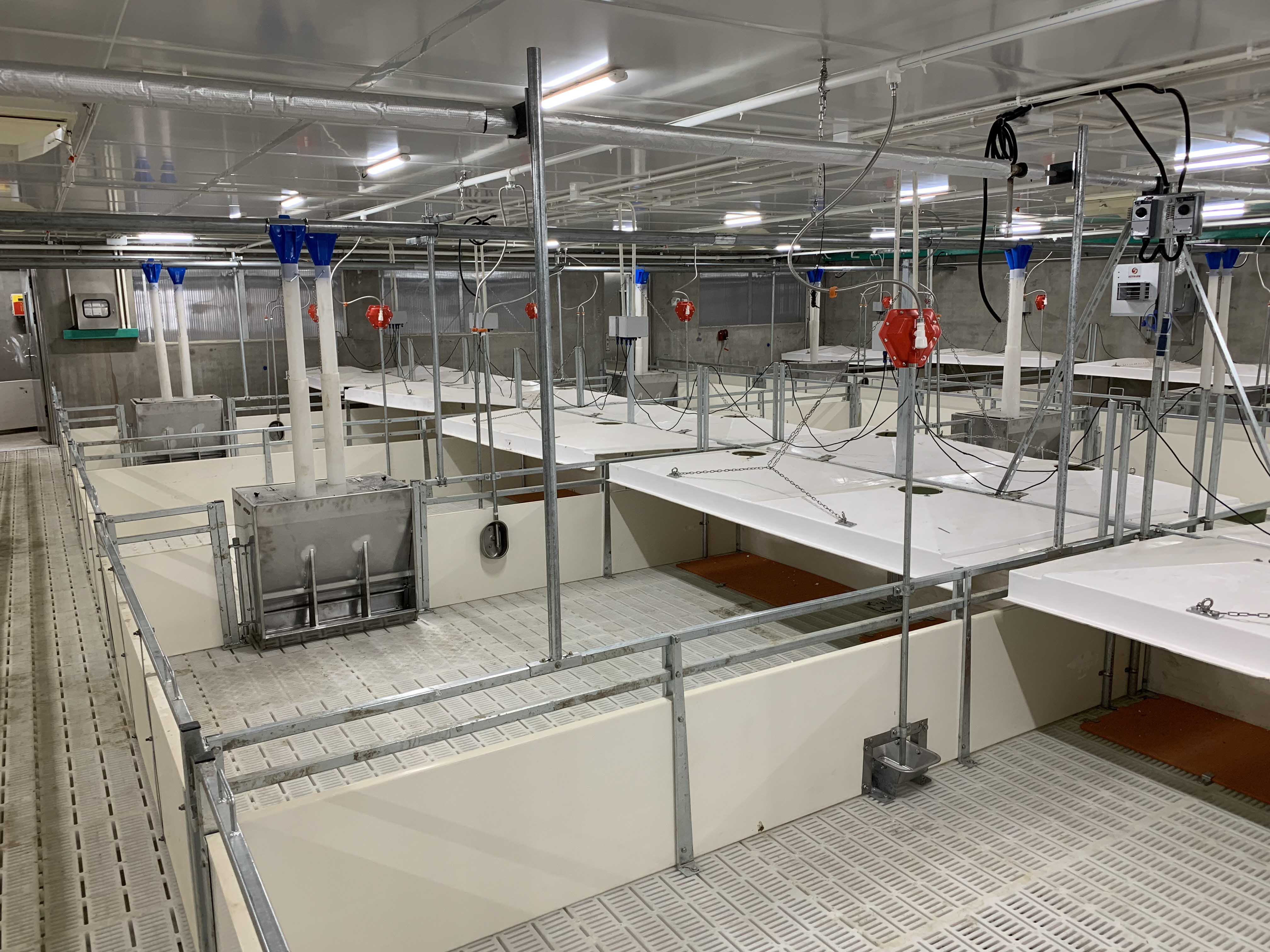專為分娩母豬與哺乳仔豬設(shè)計,每欄飼養(yǎng)1頭母豬+1窩仔豬,限制飼喂;每欄1套保溫燈+ABS透明保溫蓋板;母豬每欄1個不銹鋼料槽、1套不銹鋼防濺式飲水器;仔豬每欄1個補料槽、1套圓形飲水碗; 母豬躺臥區(qū)為高強度的鑄鐵地板或三棱鋼地板,仔豬區(qū)為PP塑料地板;仔豬圍欄采用500mm高PVC空心板;優(yōu)質(zhì)的圍欄與床面設(shè)計提供干凈、溫暖的產(chǎn)仔環(huán)境,減少母豬、仔豬疾病的發(fā)生,提高仔豬成活率。